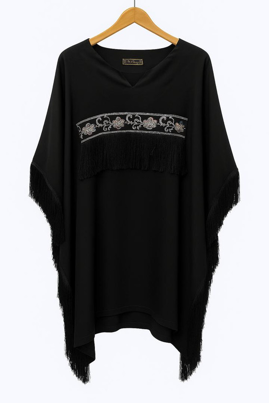 پانچو زنانه کوتاه یقه چاکدار مشکی طرح دار حاشیه ریشدار